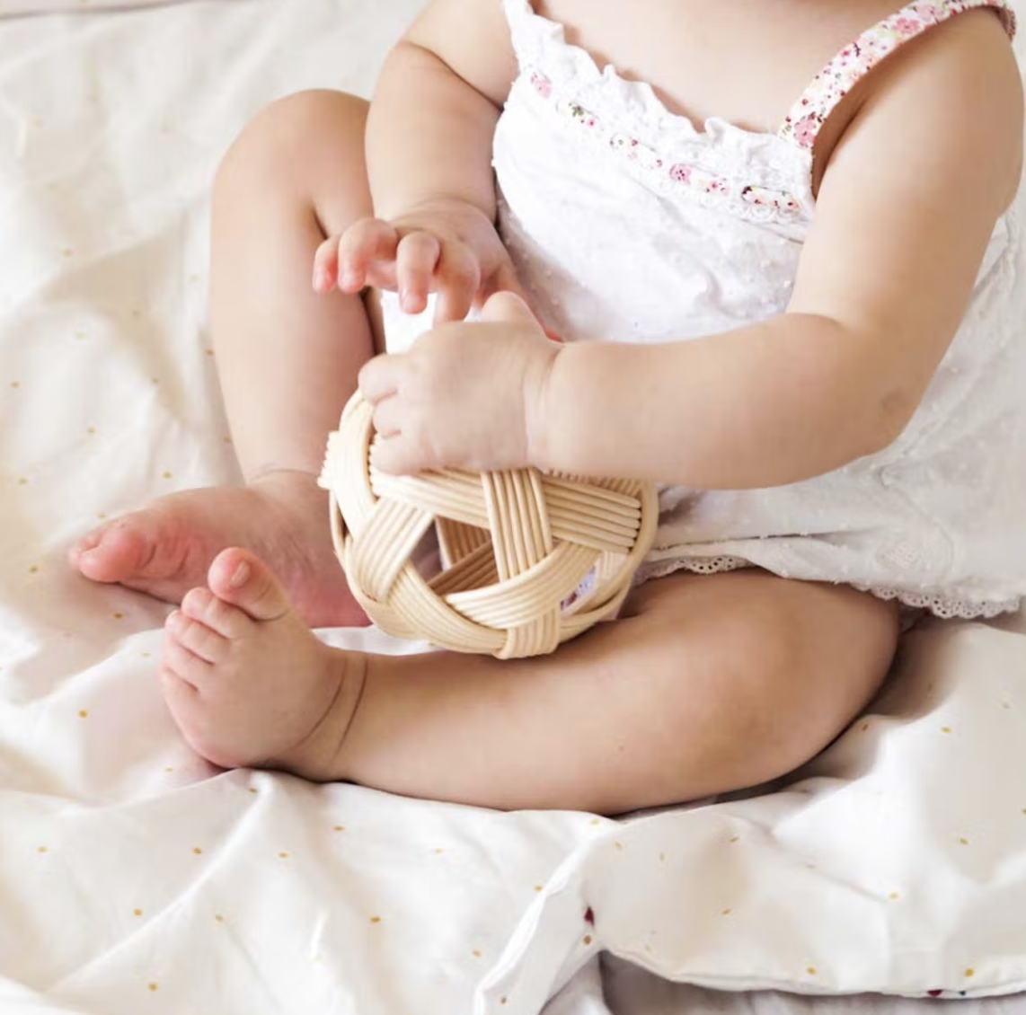 A bola Pikler é feita à mão e é fácil de segurar, o que a torna mais atraente para o pequeno. Também lhe dá total liberdade de movimento, pois não pesa