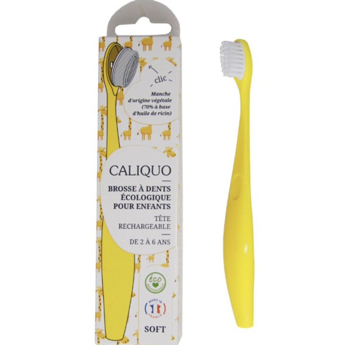 A Escova de Dentes Amarela de Criança com Cerdas Amovíveis da Caliquo é uma escova de dentes recarregável para crianças dos 2 aos 6 anos!