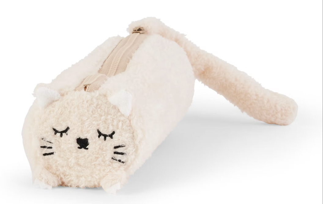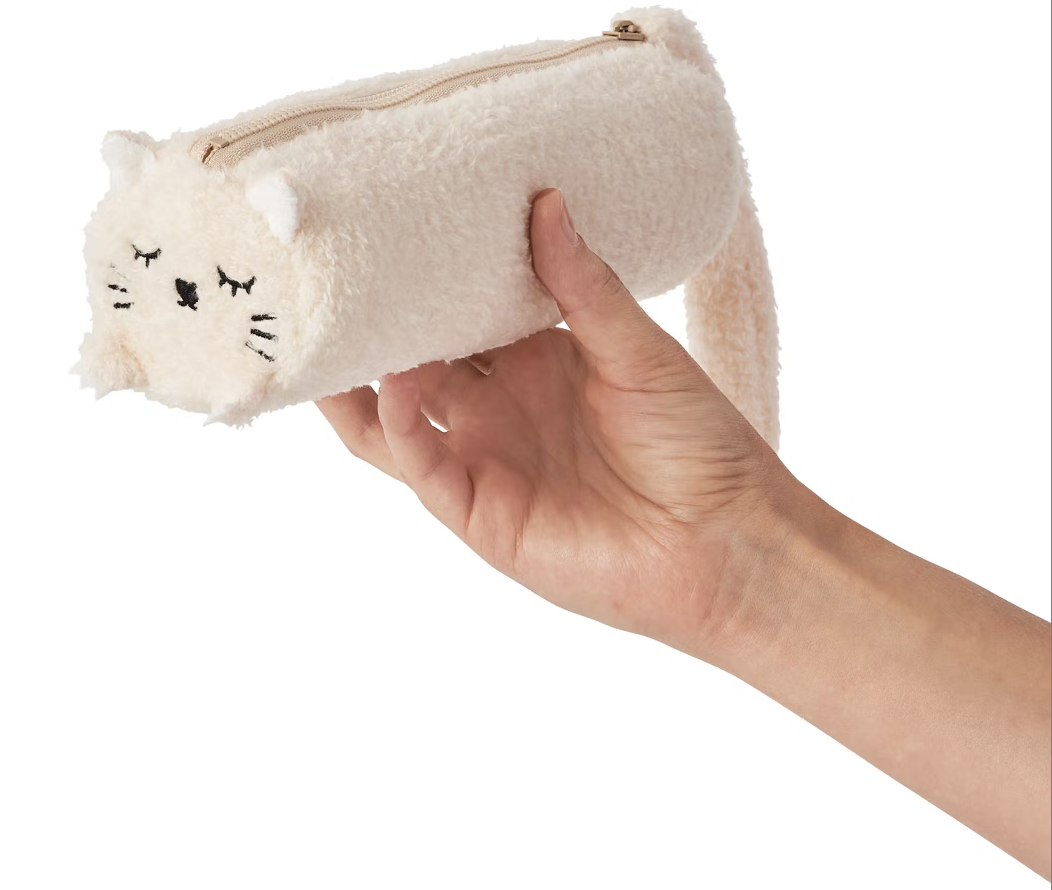Este estojo e lápis e canetas Ricemimi tem um exterior creme, é felpudo e tem um forro impermeável para evitar qualquer derrame de tinta.