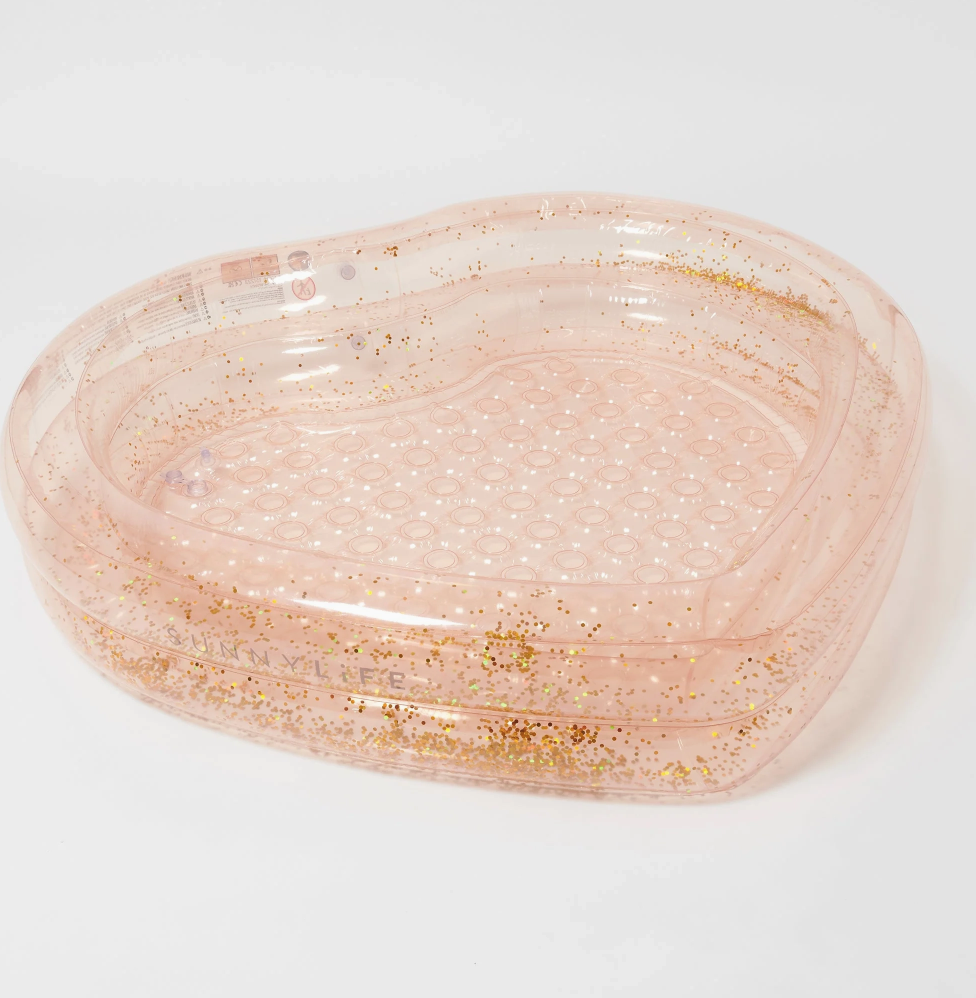 Approximate water capacity: 180L Includes flowing glitter. Special valve designed to prevent glitter from escaping the inflatable. Soft inflatable floor for extra comfort. Ideal size for family fun in the garden. Suitable for children aged 3 and up. Includes a repair patch in case of puncture. Made of durable, non-toxic, and phthalate-free PVC. Our floats and inflatables carry important safety labels that may not appear in all photos. This is not a life-saving device, to be used under constant and competent supervision. Use only on land.
