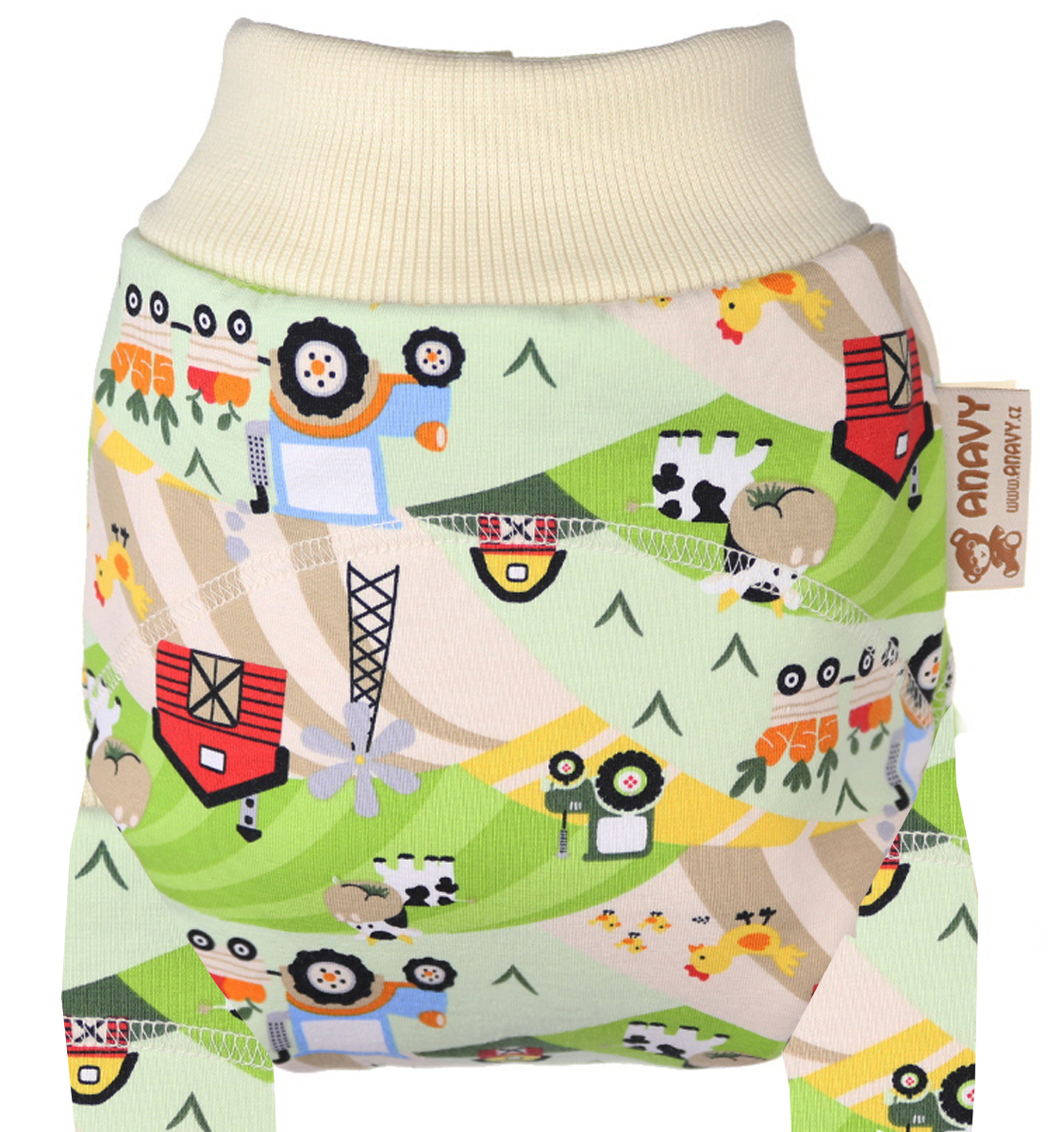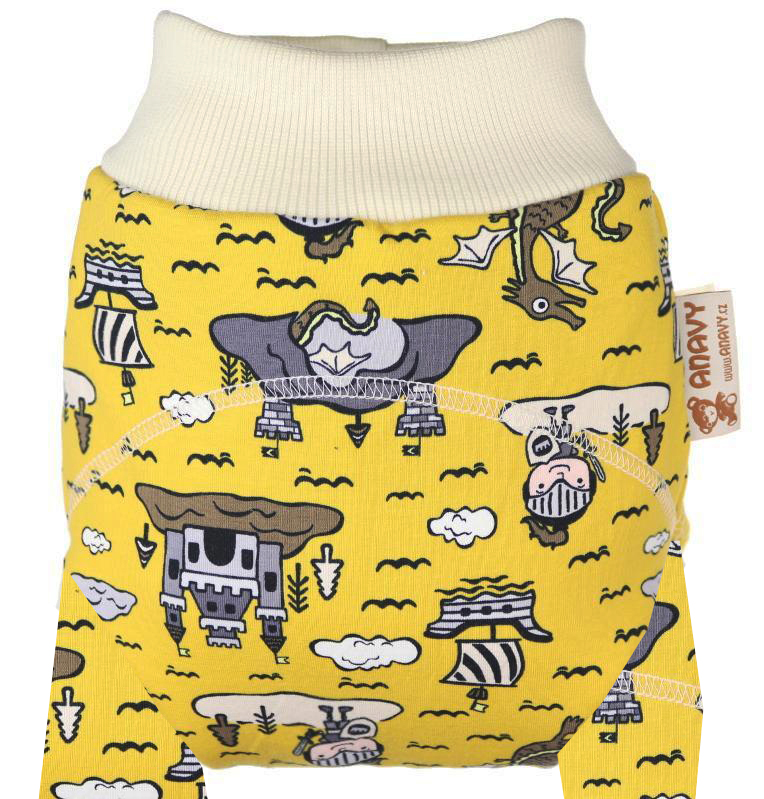 - As longies da anavy são apenas cobertas por lã merino na zona da fralda (costurada em duas camadas para prevenir ao máximo possíveis fugas) sendo toda a extensão da perna de algodão apenas;