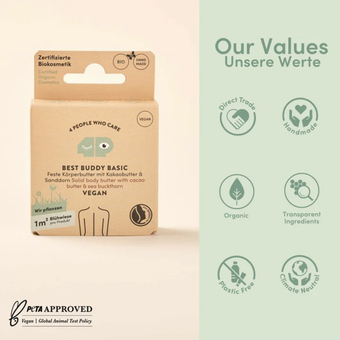 Os cosméticos da 4 People Who Care são certificados pela NATRUE e são dermatologicamente testados. Além disso, todos os produtos são climate neutral (neutros para o clima) e contêm apenas ingredientes que todos nós conhecemos. Todos os produtos tem selo PeTA Approved.