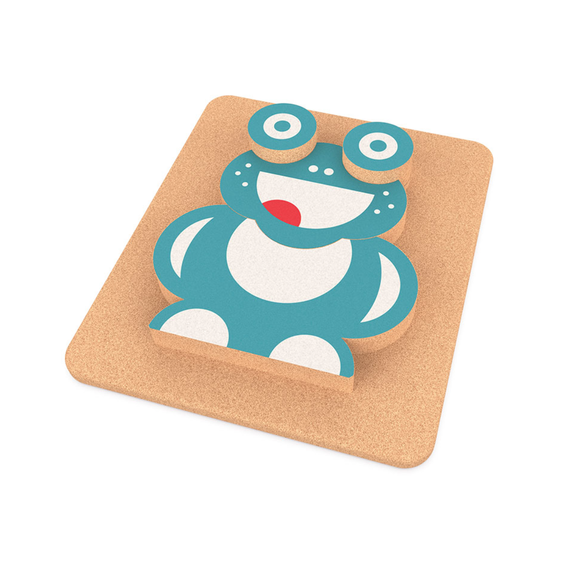 Puzzle 3D em cortiça, em forma de sapo sorridente, com diferentes peças e camadas.