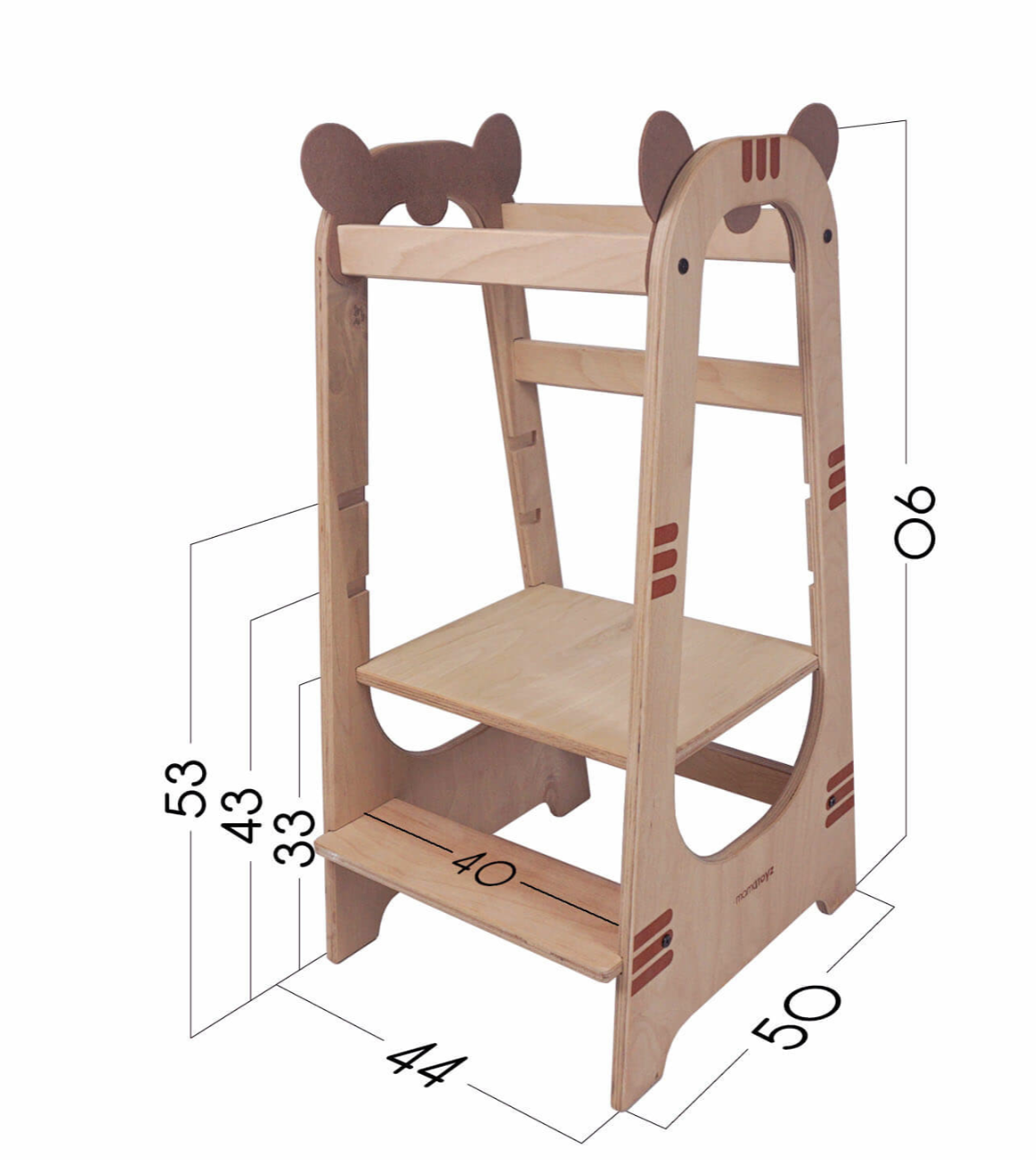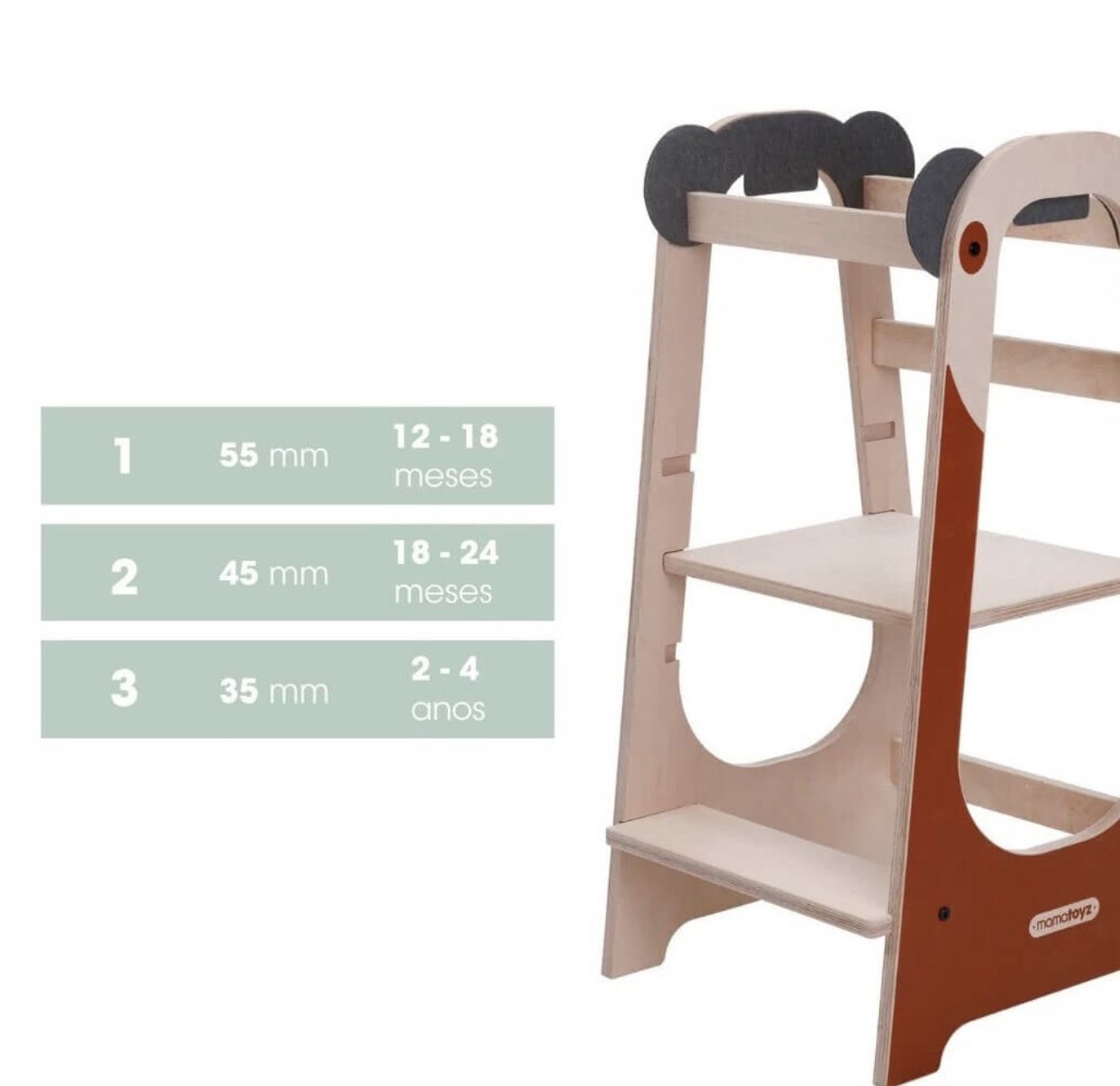 A torre possui um degrau e uma barra de segurança para facilitar o acesso, para que se sinta capaz de subir sozinho com total segurança, graças à sua base estável e resistente. Além disso, esta torre de aprendizagem possui 3 níveis de altura, reguláveis, o que permite a sua utilização ser adaptada ao crescimento da criança, para poder utilizá-la durante muito tempo.